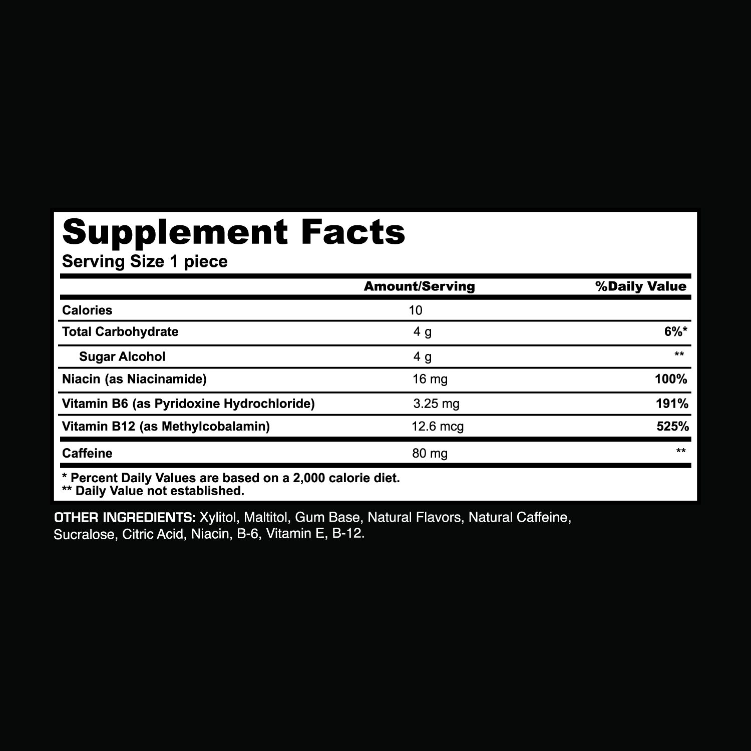 Xylitol, Maltitol, Gum Base, Natural Flavors, Natural Caffeine, Sucralose, Citric Acid, Niacin, Vitamin B-6, Vitamin E, and Vitamin B-12.