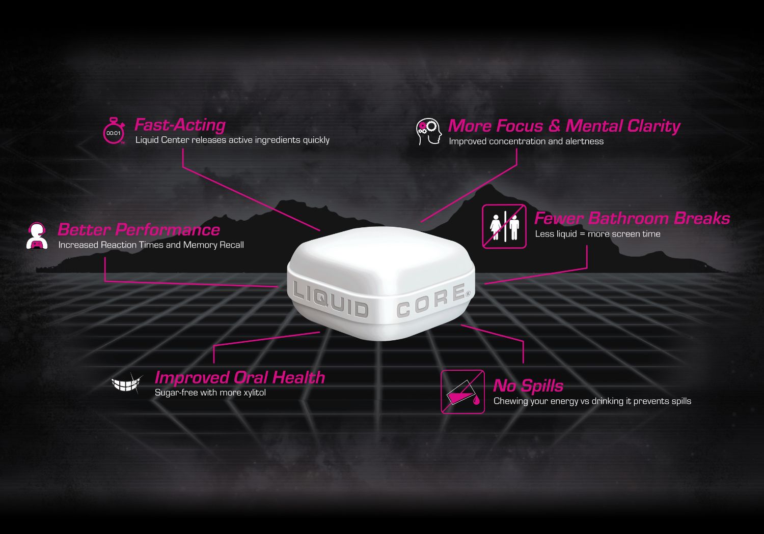 Caffeinated chewing gum with a unique liquid center. No spills. Fewer breaks while gaming. Increased focus from the act of chewing. Enhanced reaction times from natural caffeine. Chewing gum designed for gamers. Energy for gamers. Sugar-free.