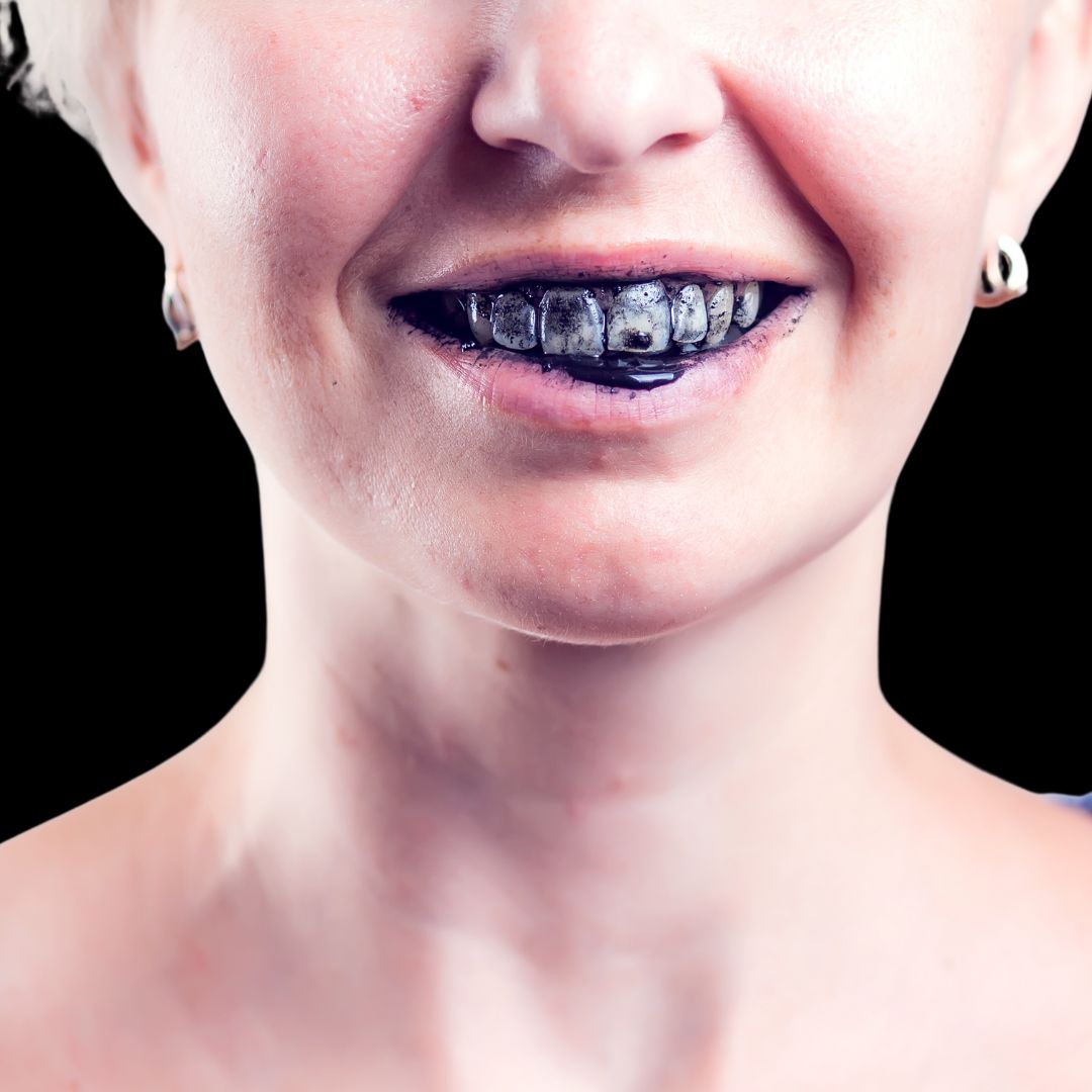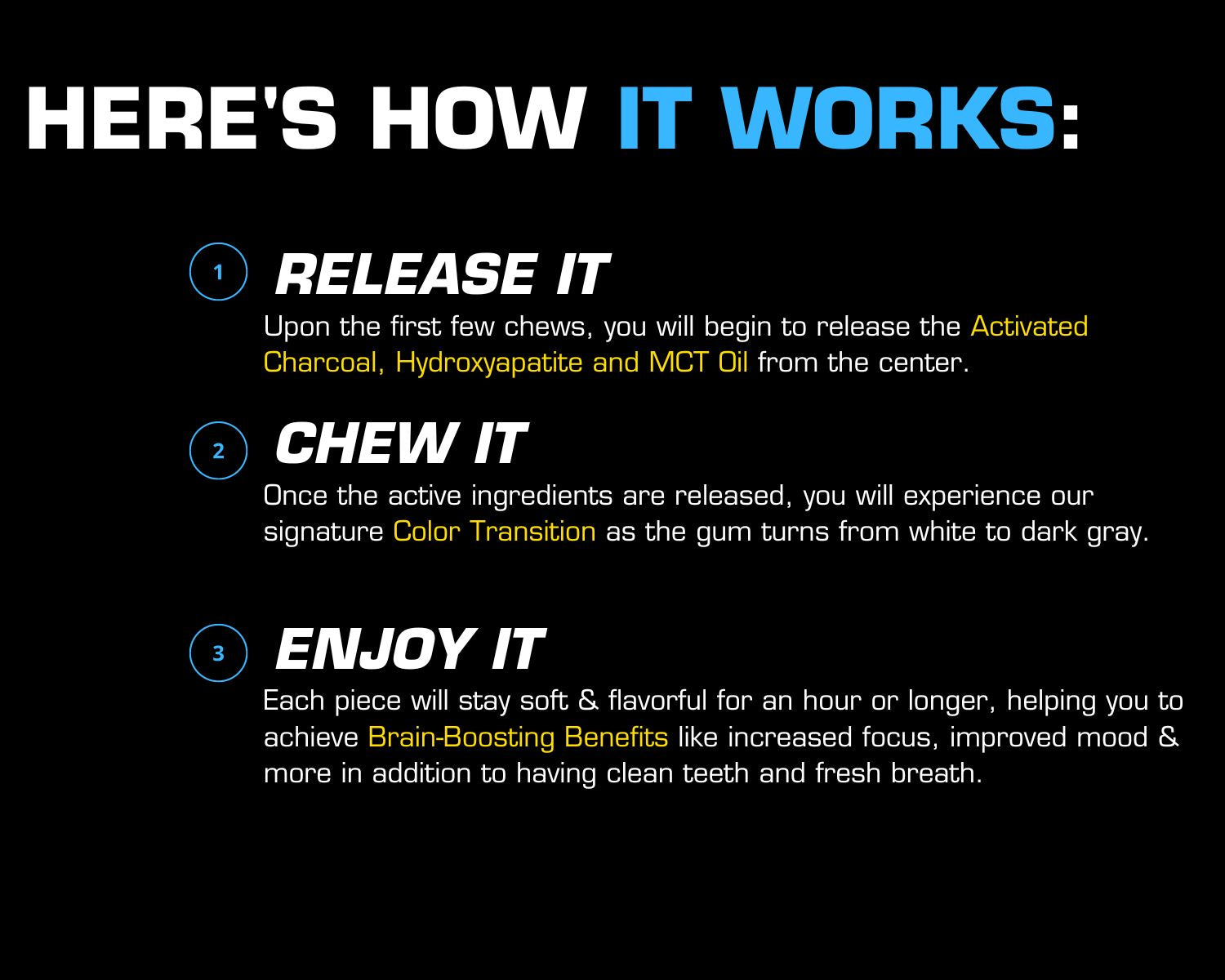 Each piece of Liquid Core® SMILE™ starts out as a white square piece of gum. Upon the first few chews, the liquid center is released and coats your teeth and gums with the black liquid. Once you continue to chew, your teeth get cleaned and your left with a black piece of gum and your teeth returned to their normal color.